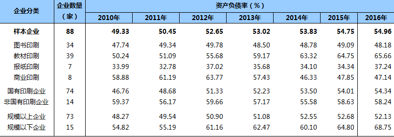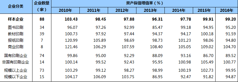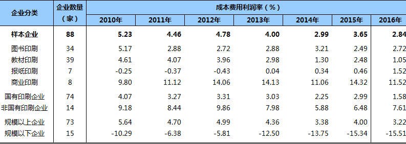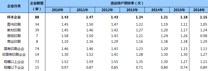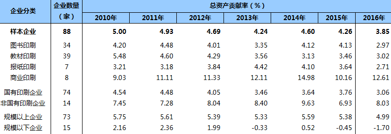 二、樣本企業(yè)經(jīng)濟運營的分層解讀 根據(jù)企業(yè)主營業(yè)務的特點,樣本企業(yè)細分為四個板塊:① 圖書印刷板塊,以圖書印刷為主營業(yè)務的34家企業(yè)構成;② 教材印刷板塊,由承擔教材印刷主力的各地新華印刷的39家企業(yè)構成;③報紙印刷板塊,由報紙印刷為主營業(yè)務的7家企業(yè)構成;④ 商業(yè)印刷,以商業(yè)印件、票據(jù)印刷和特種印刷為主的8家企業(yè)構成。 對樣本企業(yè)經(jīng)濟運營的分層解讀,就是在對樣本企業(yè)整體把握的情況下,將其進一步劃分為圖書、教材、報紙、商業(yè)四個業(yè)務板塊,對各個業(yè)務板塊經(jīng)濟運營指標增長指數(shù)和經(jīng)濟效益指標發(fā)展態(tài)勢進行說明。 2016年圖書印刷板塊34家樣本企業(yè)的主營業(yè)務收入指數(shù)135,較2015年增長4%;同期,圖書印刷樣本企業(yè)的利潤指數(shù)為66(增長11%),應繳增值稅指數(shù)202(增長12%),成本費用指數(shù)126(增加1%),從業(yè)人員指數(shù)89(下降3%),資產(chǎn)總額指數(shù)124和負債總額指數(shù)121與2015年持平。 2016年圖書印刷樣本企業(yè)工業(yè)經(jīng)濟效益綜合指數(shù)為124.99%,較2015年提升了8.21個百分點,保持了連續(xù)3年的增長態(tài)勢。與2015年相比,圖書印刷板塊6項經(jīng)濟效益指標中改善幅度最大的是全員勞動生產(chǎn)率(+1.69萬元/人)。其次是資產(chǎn)保值增值率(+0.25百分點)、成本費用利潤率(+0.23百分點)和資產(chǎn)負債率(-0.92百分點);基本持平的指標有流動資產(chǎn)周轉率(-0.06次/年);而下降的指標為資產(chǎn)貢獻率(-1.16百分點)。 表2-1-1 2010-2016年樣本企業(yè)(圖書)經(jīng)濟運營指標增長指數(shù)一覽表 綜合觀察2010-2016年圖書印刷板塊數(shù)據(jù)(參照表2-1-1,表2-1-2),過去7年圖書印刷板塊主營業(yè)務收入和全員勞動生產(chǎn)率始終保持增長的態(tài)勢。與此同時,圖書印刷企業(yè)利潤快速下降,進而影響到企業(yè)的成本費用利潤率和資產(chǎn)貢獻率起伏波動不斷走低。與其他業(yè)務板塊不同的是,同期圖書印刷企業(yè)的資產(chǎn)負債率和資產(chǎn)保值增值率的相對穩(wěn)定。 表2-1-2 2010-2016年樣本企業(yè)(圖書)工業(yè)經(jīng)濟效益指標一覽表 2016年教材印刷板塊39家樣本企業(yè)的主營業(yè)務收入指數(shù)144,較2015年增長0.5%;同期,教材印刷樣本企業(yè)的利潤指數(shù)為35(下降57%),應繳增值稅指數(shù)108(下降0.5%),成本費用指數(shù)154(增加2.4%),從業(yè)人員指數(shù)79(下降5.8%),資產(chǎn)總額指數(shù)142(增加0.9%)和負債總額指數(shù)163(增加3.9%)。 2016年是教材印刷板塊經(jīng)濟效益轉差的一年。該年教材印刷板塊工業(yè)經(jīng)濟效益綜合指數(shù)為107.27%,較2015年下降了近6個百分點。2016年教材印刷板塊運營狀態(tài)處于黃燈區(qū)。與2015年相比(參照表2-2-2),教材印刷板塊6項經(jīng)濟效益指標中,除了流動資產(chǎn)周轉率(+0.07次)和全員勞動生產(chǎn)率(+0.05萬元/人)基本持平外,其他指標均處于下降狀態(tài)。資產(chǎn)保值增值率降低8.59百分點,成本費用利潤率降低1.43百分點,資產(chǎn)貢獻率降低0.44百分點。資產(chǎn)負債率在突破全國工業(yè)標準值的情況下,有增加了近1個百分點。 表2-2-1 2010-2016年樣本企業(yè)(教材)經(jīng)濟運營指標增長指數(shù)一覽表 觀察2010-2016年教材印刷板塊數(shù)據(jù)(表2-2-1,表2-2-2),過去7年教材印刷板塊經(jīng)濟效益綜合指數(shù)始終處于不穩(wěn)定的波動狀態(tài),其運營狀態(tài)均處于黃燈區(qū)(運營警示區(qū))。盡管教材印刷板塊主營業(yè)務收入連續(xù)增長,其應繳增值稅卻未增加多少,同期的全員勞動生產(chǎn)率也提升有限,影響應繳增值稅和全員勞動生產(chǎn)率的因素是板塊的增加值增長受限(多年不變的價格體現(xiàn))。而為了維持低值的生產(chǎn)運轉,資產(chǎn)負債率最高、成本費用利潤率最低的業(yè)務板塊。 表2-2-2 2010-2016年教材印刷板塊(39家)工業(yè)經(jīng)濟效益指標一覽表 2016年報紙印刷板塊7家樣本企業(yè)的主營業(yè)務收入指數(shù)104,較2015年下降了14.8%;同期,報紙印刷樣本企業(yè)的利潤指數(shù)為-660(下降228.3%),應繳增值稅指數(shù)122(下降6.3%),成本費用指數(shù)98(下降0.8%),從業(yè)人員指數(shù)77(下降5.3%),資產(chǎn)總額指數(shù)99(下降1.8%)負債總額指數(shù)104(增加10.2%)。 2016年報紙印刷板塊運營狀態(tài)仍然處于運營警示區(qū)(黃燈區(qū)),其工業(yè)經(jīng)濟效益綜合指數(shù)為112.17,比2015年下降了6.29個百分點(參見表2-3-2)。同期,報紙印刷板塊6項經(jīng)濟效益指標中,除了有所改善的有成本費用利潤率(+1.06百分點)外,其他5個指標均處于惡化狀況。下降幅度最大的指標是資產(chǎn)保值增值率(-3.26百分點);其次是資產(chǎn)負債率(+2.9百分點),全員勞動生產(chǎn)率(-0.98萬元/人),資產(chǎn)貢獻率(-0.93百分點)和流動資產(chǎn)周轉率(-0.28次)。 表2-3-1 2010-2016年樣本企業(yè)(報紙)經(jīng)濟運營指標增長指數(shù)一覽表 觀察2010-2016年數(shù)據(jù)(表2-3-1,表2-3-2),報紙板塊主營業(yè)務收入在經(jīng)歷了2011年、2012年的增長后,從2013年到2015年其總量基本保持了三年不變。2016年是報紙板塊主營業(yè)務收入下降幅度最大的一年,進而引發(fā)到當年板塊多數(shù)經(jīng)濟效益指標的下降。鑒于互聯(l