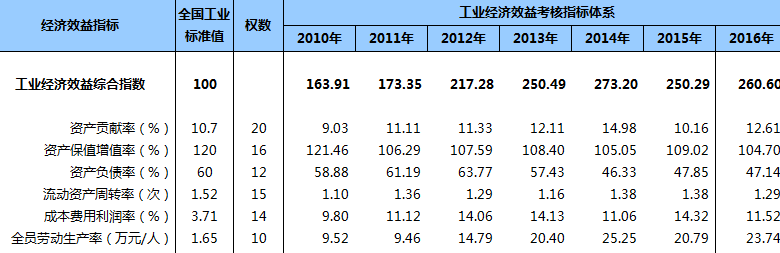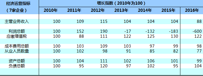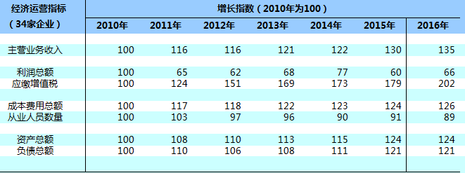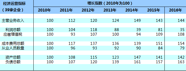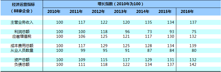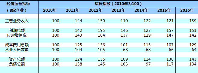 一、2016年樣本企業(yè)經(jīng)濟運營的基本狀況 2016年88家樣本企業(yè)的主營業(yè)務收入合計111.05億元,資產(chǎn)總額189.68億元,應繳增值稅4.72億元,實現(xiàn)利潤2.94億元。與2015年相比,樣本企業(yè)主營業(yè)務收入同比增長2.5%,資產(chǎn)總額同比增長1.3%,應繳增值稅同比增長1.9%,利潤同比下降近20%。 表1-1 2010-2016年樣本企業(yè)經(jīng)濟運營指標增長指數(shù)一覽表 觀察2010-2016年間經(jīng)濟運營指標增長指數(shù)的變化(參見表1-1),樣本企業(yè)的主營業(yè)務收入增長雖然波動起伏,但基本呈持續(xù)擴大的態(tài)勢。2016年樣本企業(yè)主營業(yè)務收入增長指數(shù)為137(延續(xù)了2013年以來的增長勢頭)。同期,體現(xiàn)生產(chǎn)投入的運營指標指數(shù)(資產(chǎn)總額132、負債總額142、成本費用總額139),以及體現(xiàn)生產(chǎn)產(chǎn)出的應繳增值稅指數(shù)132也同樣保持增長。而從業(yè)人員指數(shù)80和利潤總額指數(shù)75(較2015年)的大幅下降,則是應該引起關注的。 表1-2 2010-2016年樣本企業(yè)主營業(yè)務收入及盈利狀況一覽表 2016年,樣本企業(yè)中主營業(yè)務收入增加的企業(yè)39家(占樣本企業(yè)的44%),利潤增長的企業(yè)48家(占樣本企業(yè)的55%),盈利企業(yè)56家(占樣本企業(yè)的64%)、虧損企業(yè)31家(占樣本企業(yè)的35%)。盡管與歷年數(shù)據(jù)對比(參見表1-2),2016年樣本企業(yè)中主營業(yè)務增長的企業(yè)數(shù)量為最少(39家,占樣本企業(yè)總數(shù)的比重44%)。2016年利潤增長企業(yè)數(shù)量占樣本企業(yè)總數(shù)的比重為55%(雖低于去年61%,但高于其他幾年),盈利企業(yè)數(shù)量占樣本企業(yè)總數(shù)的比重64%(與去年持平,處對比年份最低點)。 那么,上述變化在工業(yè)經(jīng)濟效益綜合指標體系中又是如何體現(xiàn)的呢? 2016年樣本企業(yè)工業(yè)經(jīng)濟效益綜合指數(shù)為138.80%,樣本企業(yè)經(jīng)濟運營仍然處于運營警示區(qū)(黃燈區(qū))。與2015年相比,樣本企業(yè)經(jīng)濟效益綜合指數(shù)提升了4.83個百分點。樣本企業(yè)其他6項經(jīng)濟效益指標中(參見表1-3),有所改善的僅有全員勞動生產(chǎn)率11.84萬元/人(+2.67萬元/人);基本持平的指標有流動資產(chǎn)周轉率1.15次(-0.03次);而下降的指標為資產(chǎn)貢獻率3.85%(-0.41個百分點)、資產(chǎn)保值增值率99.20%(-0.71個百分點)、資產(chǎn)負債率54.96%(+0.21個百分點)和成本費用利潤率2.84%(-0.81個百分點)。 表1-3 2010-2016年樣本企業(yè)(88)家工業(yè)經(jīng)濟效益指標一覽表 樣本企業(yè)整體的工業(yè)經(jīng)濟效益綜合指數(shù)持續(xù)改善主要是全員勞動生產(chǎn)率提高推動的結果。但同期多數(shù)相關經(jīng)濟效益指標(資產(chǎn)貢獻率、資產(chǎn)負債率、流動資金周轉率和成本費用利潤率)上下波動的事實表明,樣本企業(yè)整體經(jīng)濟運營狀態(tài)的尚未得到實質性的改善。
