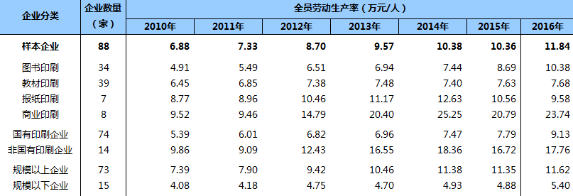 2016年書刊印刷企業(yè)經(jīng)濟運營統(tǒng)計數(shù)據(jù)解讀《2016年全國109家書刊印刷企業(yè)完成經(jīng)濟效益統(tǒng)計資料匯編》是由中國印工協(xié)書刊印刷專業(yè)委員會、北京印刷協(xié)會和中國人民解放軍印刷協(xié)會共同編輯整理的。2016年書刊印刷企業(yè)經(jīng)濟運營統(tǒng)計數(shù)據(jù)解讀是通過對其中樣本企業(yè)相關各項經(jīng)濟指標展開的。 這些樣本企業(yè)的選擇主要以數(shù)據(jù)連續(xù)(五年上報數(shù)據(jù))和覆蓋面廣(國內27個省、市、自治區(qū)均有企業(yè)被選)為標準。從2014年開始到2016年,經(jīng)過三年的不斷調整和完善,88家企業(yè)已經(jīng)基本固定,成為我們了解全國書刊印刷行業(yè)經(jīng)濟運營狀態(tài)的樣本。 對樣本企業(yè)經(jīng)濟運營統(tǒng)計數(shù)據(jù)的解讀主要使用了經(jīng)濟運營指數(shù)和經(jīng)濟效益綜合指數(shù)。前者是以2010年為基點,將之后年份企業(yè)運營指標指數(shù)化,通過指標指數(shù)的變化了解和觀察行業(yè)運營變化的態(tài)勢;后者包括工業(yè)經(jīng)濟效益綜合指數(shù)及其相關的7個單項指標,從不同角度反映企業(yè)運營內在機制。最后,根據(jù)工業(yè)經(jīng)濟效益綜合指數(shù)確定書刊印刷行業(yè)所處的運營狀態(tài)區(qū)間。 2016年樣本企業(yè)經(jīng)濟運營統(tǒng)計數(shù)據(jù)解讀包括四個部分: